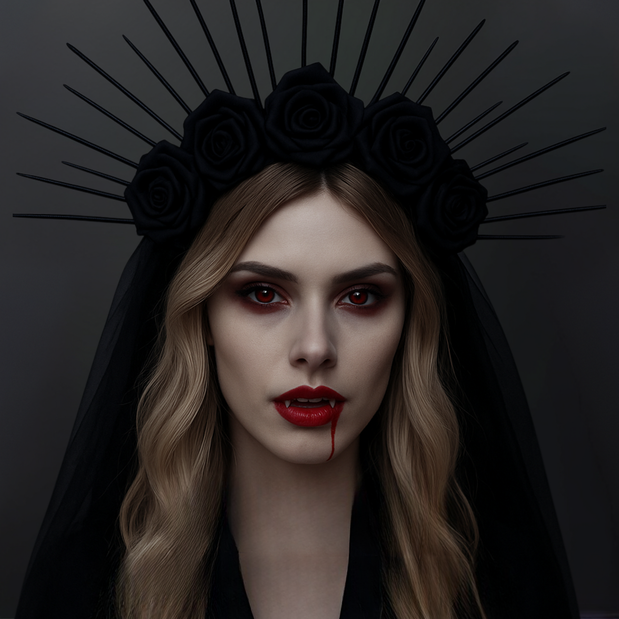 She—your vampiric shadow—doesn’t chase trends. She is shift and spectacle, blood and metal. Fangs, chains, velvet, venom—she dresses like every moment matters. And so do you.