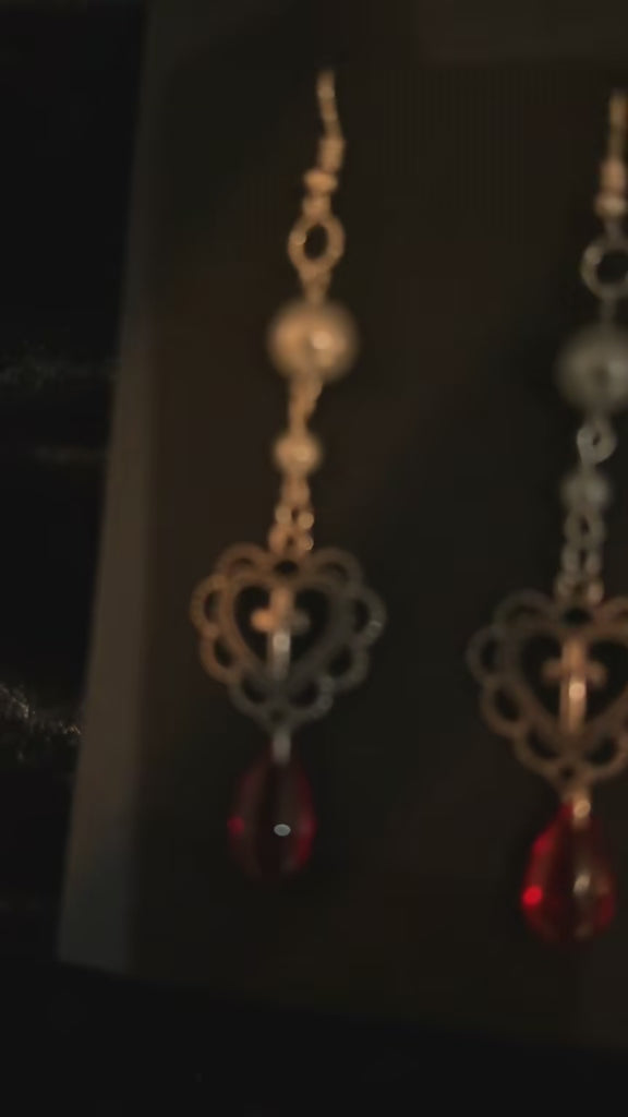 Each pair features soft pearl accents leading down to an ornate lace-style heart with a tiny cross at its centre… finishing with a deep blood-red teardrop that catches the light like fresh crimson.